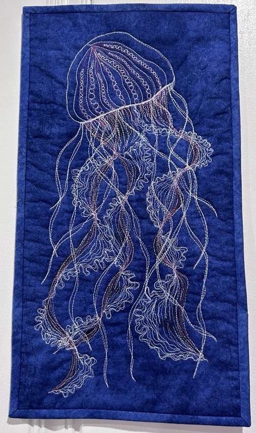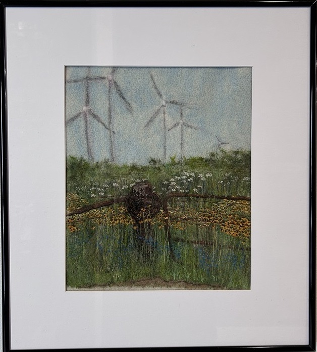 Working with pure wool, silk, and cotton fabric, usually “recycled” from thrift store finds along with wool roving and thread, Ms. Roe uses many of the skills she learned as a small child. Her work encompasses representational work depicting flowers and the rural scenery of Iowa, and non-representational work expressing emotions and dreams. She often creates whimsical work that reveal her sense of humor and imagination. She combines needle-felting, applique, machine “thread sketching”, crochet, and hand embroidery in new ways – ways that set her work apart from traditional fiber arts.